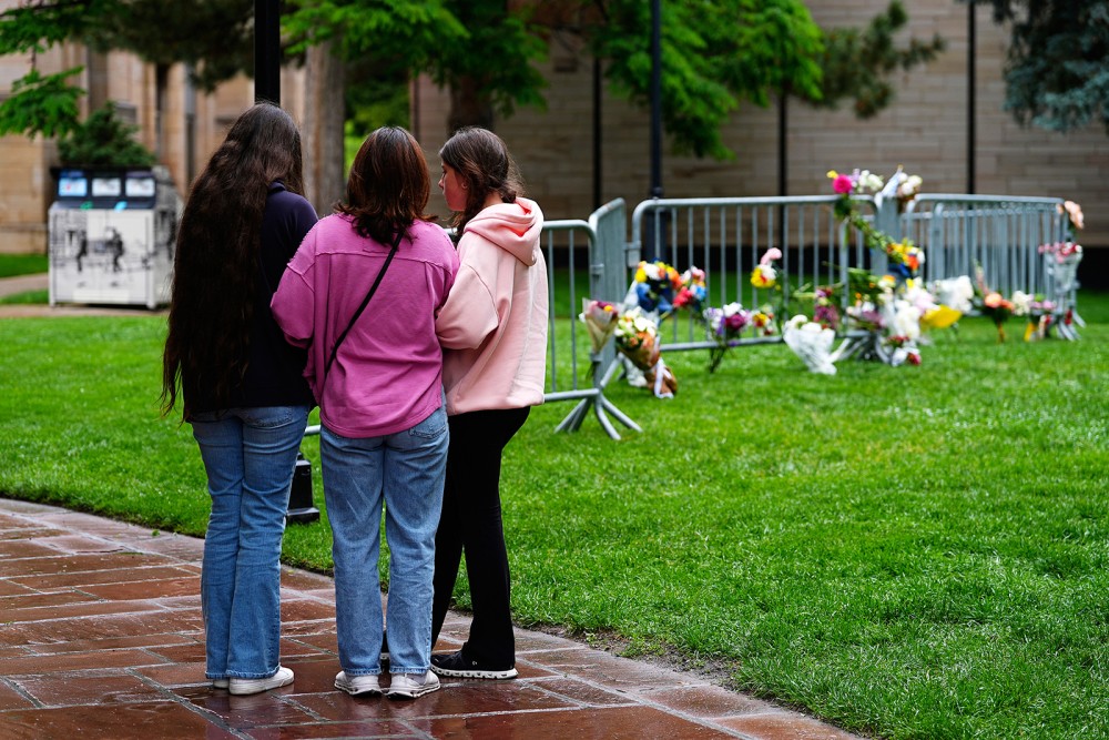 Passers-by pause for a moment at a makeshift memorial for victims of an attack outside of the Boulder County, Colorado, courthouse on June 3. (AP Photo/David Zalubowski)