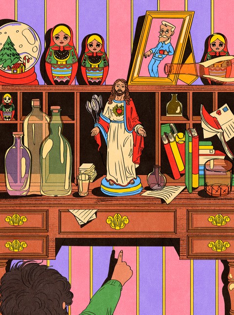 We all turned to consider the options: a set of nesting dolls of Russian leaders my partner got in Moscow in the early ’90s, a potted succulent, and a small ceramic statue of Jesus we normally used to hold teaspoons. I had moved Jesus to the desk as a holiday decorating effort, since his robe and burning sacred heart were red.
