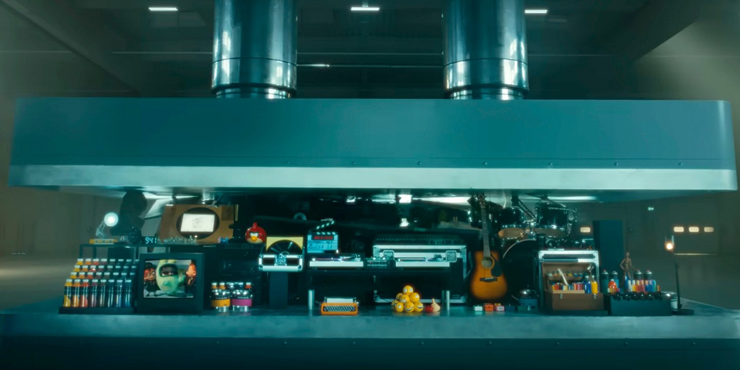 Ametronome ticks as a Cher record spins to life on a turntable. The camera pulls back to reveal these objects arranged neatly on a hydraulic press—along with a trumpet, a piano, a guitar, analog cameras, cans of paint, leather-bound journals, old computer monitors, and even a stack of foam emojis. As the press plate lowers, the trumpet is crushed, the paint cans burst, and the camera lenses shatter. The emoji often used to convey a sense of stunned embarrassment is caught at the edge of the press, wide eyes bulging as its pink cheeks are squashed into oblivion, pulverized with all those older tools of expression in a final blast of dust and detritus. When the press opens, we see the debris has disappeared—or rather, it’s been compressed and packaged neatly as the thinnest, lightest, most powerful iPad yet. A disembodied hand offers it to the viewer as Cher sings, “All I ever need is you.”