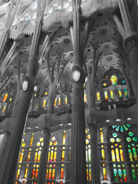 Walking into Sagrada Familia, there’s no mistaking it for anything but a modern cathedral, a cathedral-in-progress. Sunlight streams through stained glass that looks watercolored and abstract, leaving pools of colored light on the ground that render one side of the nave in greens and blues, the other in reds and yellows, the stone bright white and unaged by centuries of candle smoke. The shapes inside might be mycelia, or a sci-fi spaceship, or grains of pollen under a microscope—the architecture takes and rearranges the natural world into new forms, so we can truly understand their glory. This is, of course, not much different than what any ancient church has done—a play on light and leaves and majesty, re-creating creation that we might understand it better. And yet, while other churches have made me gasp and wonder, stepping into Sagrada Familia brought tears to my eyes.