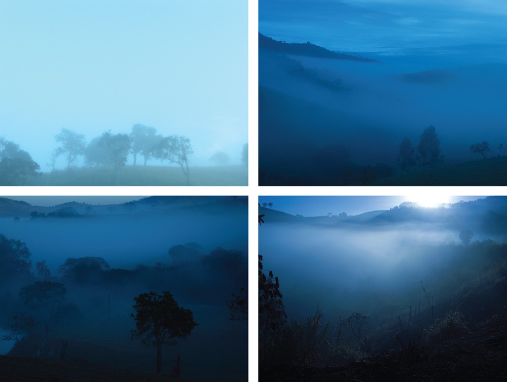 This investigation dates back to early childhood. Assumpção tells me that her mother recalls her absorption with blue hues beginning at age two. Decades later, the fascination evolved into an art practice that invited viewers to immerse themselves in blue through artworks both miniature and monumental. In Suíte Azul, she captures natural elements that open visual clearings for her audience to meditatively inhabit such spaces. Some of the landscapes in the series are photos taken in the Brazilian state of Minas Gerais. She would wake up hours before sunrise to capture a terrain that has suffered deeply from deforestation—and has also experienced regeneration at the hands of a man committed to rewilding that stretch of land, the artist’s own father. Suíte Azul stands as an ode to the power of restoring the land, one seed and one sunrise at a time.