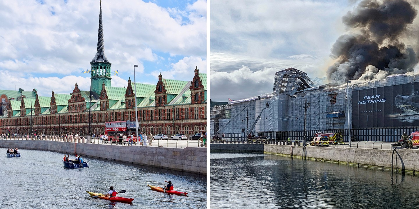 Copenhagen’s Børsen Stock Exchange before (2022) and after the devastating April 2024 fire. (Photos by Jakubhal / Penguin / W.carter /Jengod, used via Creative Commons license)