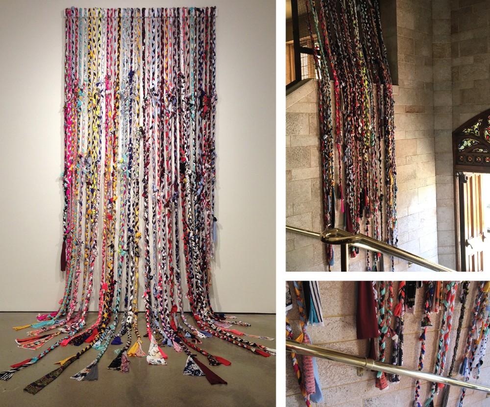 Through the project Remem-bearing as Refugees, Kim shares the capaciousness of art by inviting others into collaborative sessions that embody the practice of bearing with one another as social repair. She offers the braid as an art form to direct conversations among groups of three. Like a dance, participants maneuver around each other to weave three long strips of brightly colored textile remnants to make a hefty braid. The act of creation becomes a space to discuss race, diversity, experiences of being misunderstood, and remedies for fear or loneliness.