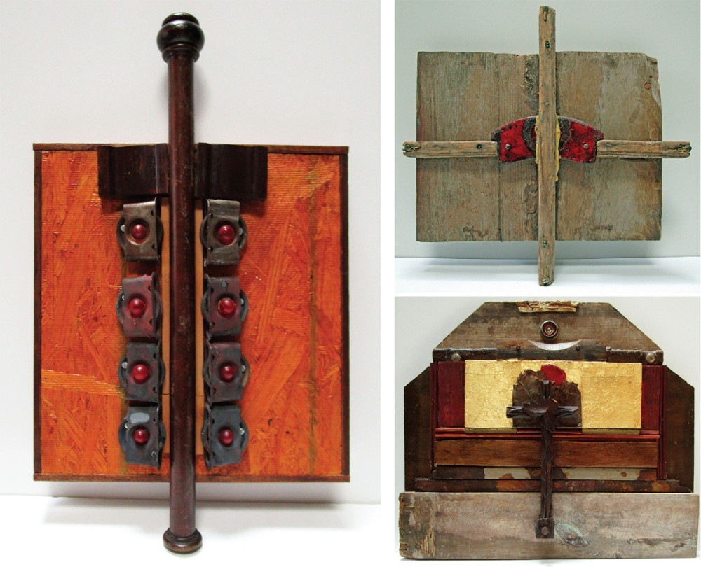 In Black Forest Cross, Young pays homage to folk artisans of faith who create rustic roadside shrines. He underscores the importance of holy writ in Scroll Cross, supporting a cruciform atop red signal lights that resemble rolled manuscripts. In the minimalist piece From His Side, weathered wood, dripping glue, and a broken red disc evoke Christ’s wounds on the cross. As Young pointed out, since the crucifixion took place in the ancient equivalent of the town dump, the Romans would likely have used discarded wood to nail together the cross on which Christ died.