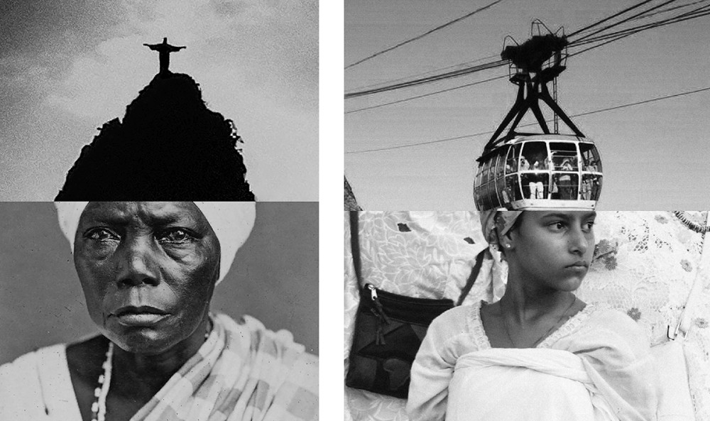 In this photomontage series, Rios juxtaposes the everyday experience, memory, and history of Black individuals against the backdrop of Rio de Janeiro’s iconic sites—usually reserved for its elite—such as Sugarloaf Mountain, Christ the Redeemer, and Ipanema Beach. “As I traveled from my home in the favelas of Rio to reach my workplace downtown,” he explained to me, “I began to note how we—the Black population of Rio—carry out this sustaining process.. . . Black people from the favelas literally carry the city on their heads.”