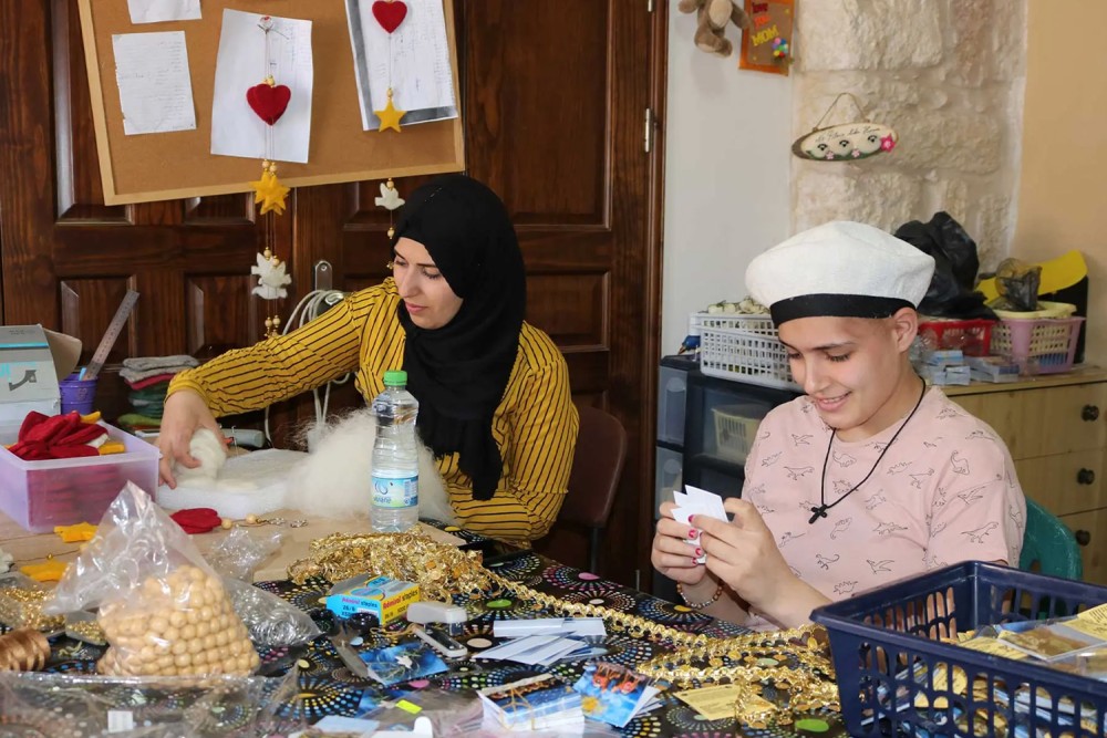 Members of the L’Arche community in Bethlehem, Ma’an Lil-Hayat, work together at a crafting table. (Courtesy photo used by permission)