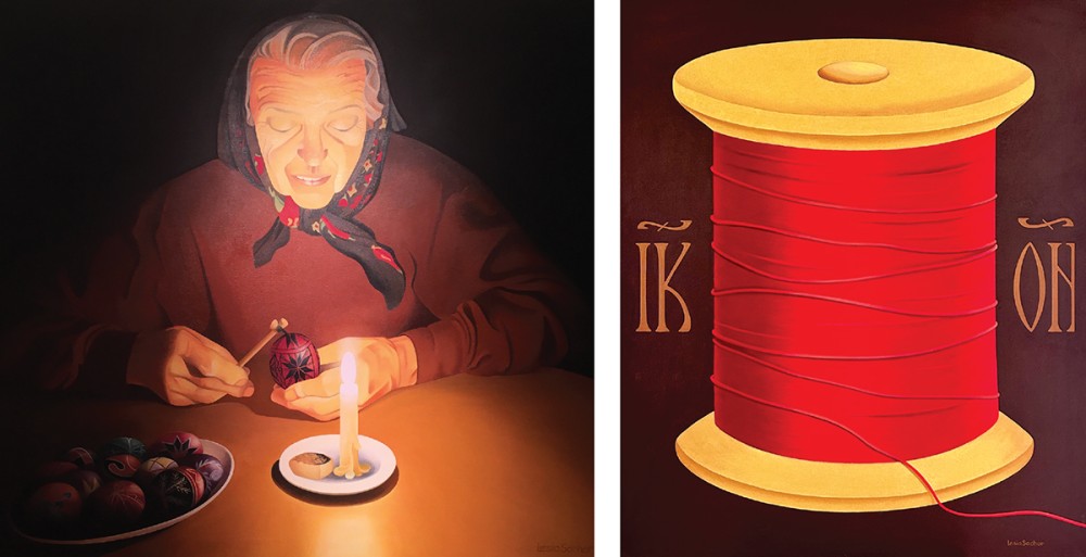 In preparation for Easter, Sochor teaches workshops around New England, passing on the practice of decorating pysanky, raw eggs embellished with richly detailed patterns produced by wax resistance. In Ritual, she depicts her late mother—illuminated by the saintly glow of a single candle—using the time-honored kistka tool to apply melted beeswax to an eggshell. Her mother’s hair is wrapped in a traditional babushka, which in a series of works becomes a symbol of piety and resistance, an emblem of the everywoman or of Mother Ukraine herself.