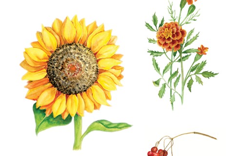 Sunflower, Marigold, Red Winter Berries (viburnum branch), by Tania Yurchenko