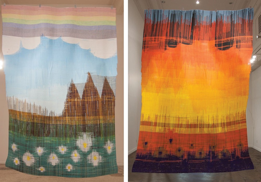 For his papel tejido (woven paper) pieces, Hurtado Segovia cuts long, thin strips of painted paper, crisscrossing them over and under. Repetition produces woven sheets reminiscent of blankets, ceremonial robes, and tapestries. Weaving yields bright plaids, images of mountain ranges, and Christian symbols. Hurtado Segovia’s jubilant forms represent three traits needed to defy alienation: festival, craft, and play.