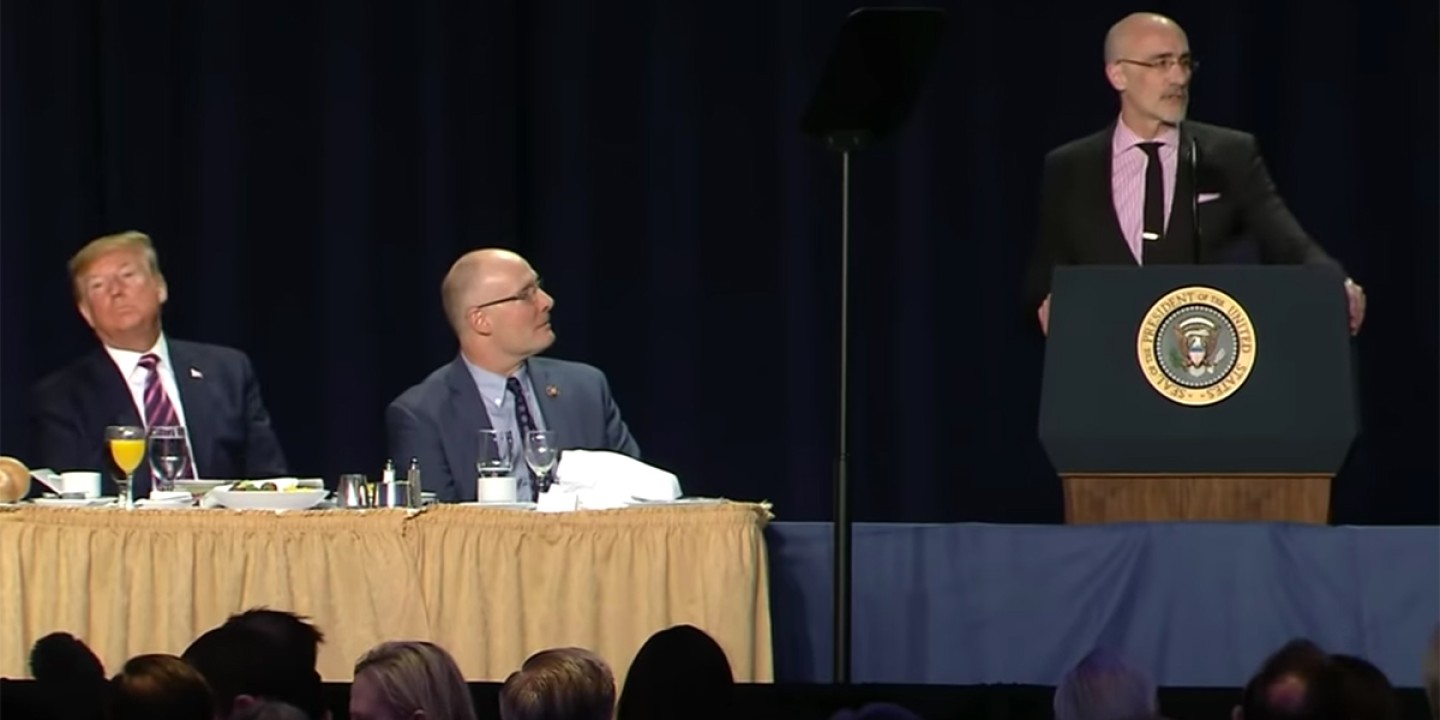 If that wasn’t an altar call in its own right, Brooks asked for a show of hands: “How many of you love somebody with whom you disagree politically?” Most of the audience raised a hand. President Trump, seated two chairs from the podium, did not. In a quick eye survey of the ballroom, Brooks said, to a crowd chuckle, “I’m going to round that off to 100 percent.” Video footage of the event (only available through whitehouse.gov) conveniently shifts from a constant wide-angle pan of the stage to a zoomed-in focus of the podium speaker himself, 30 seconds before the audience hears the question.