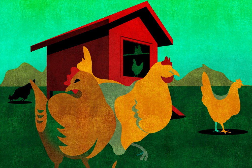 I decked out their chicken coop to the hilt. Beyond the standard feeders and waterers, we installed an automatic door that let them out first thing in the morning and closed after they settled in for the night. We set up cameras inside and outside the coop. I put in a sprinkler system to cool them in the heat and a heater to warm them in the cold and, in an attempt to weatherproof them against Texas’s brutally hot summers, even rigged an air-conditioning system using frozen water jugs and a fan. I was determined to turn them into tech natives, outfitted with the latest (chicken) gadgets.