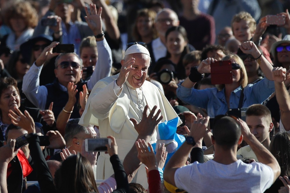 Pope Francis greets the crowd gathered in St. Peter’s Square during his weekly general audience at the Vatican in 2017 (AP Photo / Alessandra Tarantino).