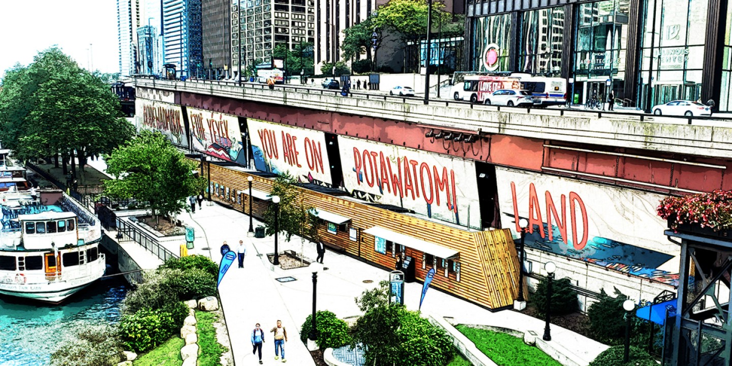 Walking in Chicago recently, I noticed another kind of land acknowledgment. It’s in the form of a public removal commemoration, but unlike the monuments Denson researches, this is Native public art, created by Grand Portage Ojibwe artist Andrea Carlson. Her mural, executed on five banners, hangs over the Chicago Riverwalk and proclaims: “Bodéwadmikik ėthë yéyék / You are on Potawatomi land.” The mural will hang for at least another year while a monuments committee explores Chicago’s public art and statuary.