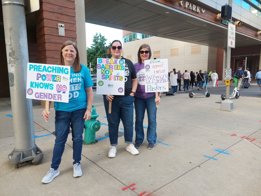 Meredith Stone, executive director of Baptist Women in Ministry, stood outside the convention center with several staffers of her organization who opposed the theology of the proposed constitutional amendment and the decision about the Alexandria church. They held signs, such as “Preaching Power Knows No Gender,” as a BWIM volunteer prayed some of the prayers recently shared with the ministry affirming women pastors.