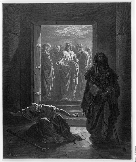 Raymond Quinsac Monvoisin’s 1865 wood engraving of the parable of the tax collector and the Pharisee (after a sketch by Gustave Doré) arranges the composition as if the viewer is on the altar looking toward the two men. The viewer is in a position of judgment. We see Jesus and his disciples watching the event from just outside the door. The Pharisee stands erect with his hands clasped in front of him. The tax collector bows down and kneels on his mat with arms wide, offering himself to God. His body language reflects his abject humility before God. Of course, it would be inappropriate to generalize from the parable that all Pharisees in Jesus’ day displayed such self-righteous piety. While some of those in Jesus’ audience who looked with contempt on others were most likely Pharisees (18:9; cf. 15:2), surely not all of them were. Luke knew also of genuinely pious religious authorities (cf. Luke 23:50–51; Acts 5:34). Nor did all tax collectors share this one’s sense of remorse (cf. Luke 5:30). Jesus’ final message summarizes the parable: “Everyone who exalts himself will be humbled, but he who humbles himself will be exalted.”