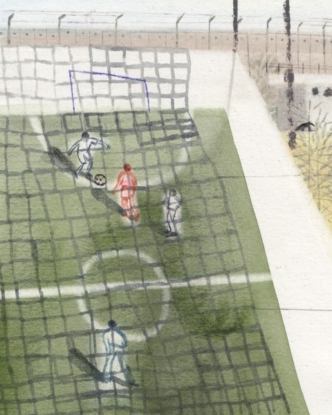 As we played and laughed, I noticed the netting above us—a web stretched from sideline to sideline, suspended in the sky by a skeleton of metal rods. Caught in the net, kept far away from the soccer field below, were more tear gas canisters. During halftime, I asked the coach about the metal cylinders tangled in the mesh. “They shoot them at us from over there,” she said, nodding at the towers and the wall beyond the community garden and playground. She explained that when they first started playing on the field, soldiers would fire tear gas and the canisters would land on the ground, forcing everyone to scatter. Now, with the netting in place, when they shoot the smoke doesn’t take as long to blow away.