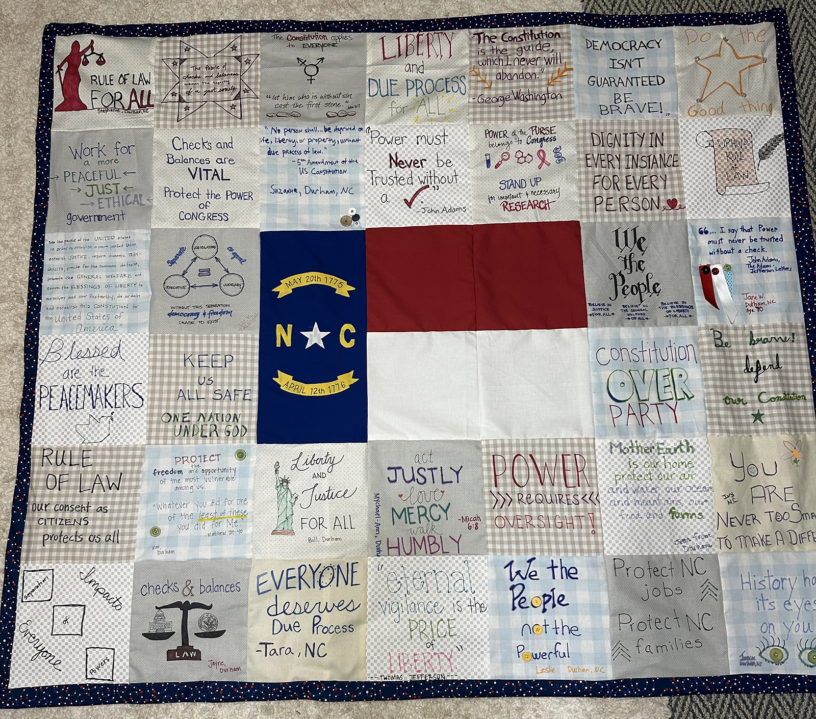 A quilt made of squares inspired by the First Article of the Constitution, made in Durham, North Carolina. (Photo by Mychael-Ann Pelo)