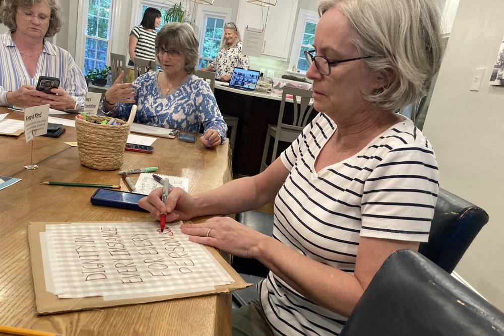 The card holders on the long dining room table offered guidance to the women assembled around it: “Keep it Constitutional” and “Keep it Kind.”