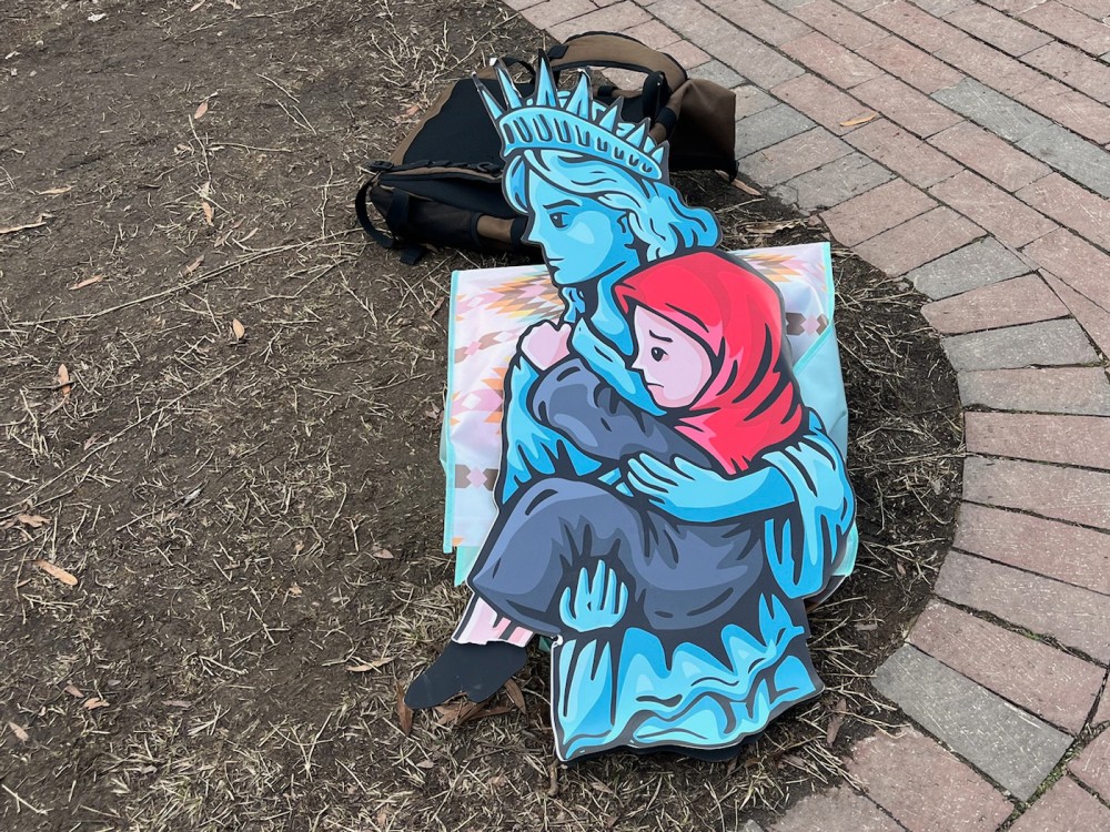 A depiction of a refugee being held by Lady Liberty during a protest in Washington, DC, February 4. (RNS photo/Aleja Hertzler-McCain)