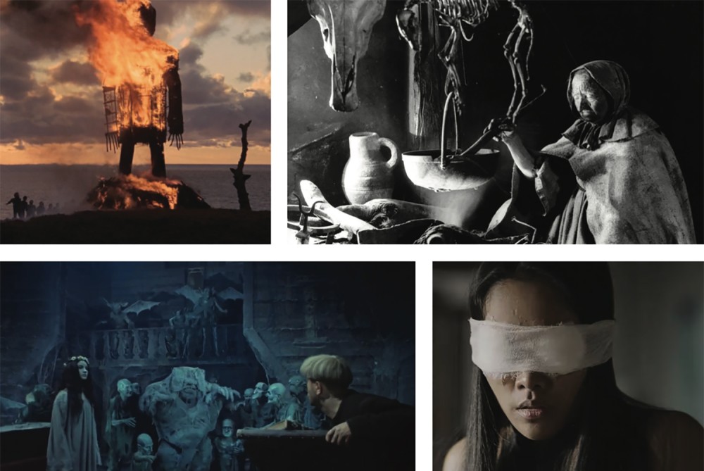 Some of the films featured in the documentary Woodlands Dark and Days Bewitched, clockwise from upper left: The Wicker Man, Häxan, Dearest Sister, Viy (British Lion Films, public domain, Lao Art Media, Mosfilm)