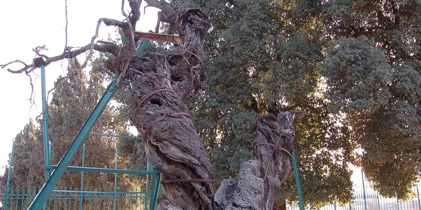In 2016 I visited the holy site where pilgrims have long journeyed to venerate Mamre’s oaks. A mile west of the old city of Hebron/Al-Khalil, on the outskirts of an industrial zone, the weathered remnants of a rugged tree—buttressed with metal braces—stand outside the doors to the Church of the Holy Forefathers on the grounds of the Russian Orthodox Monastery of the Holy Trinity. A monk welcomed me to the compound and escorted me up the hill to the vestige of the scene in Genesis. I walked slowly around the tree, then around again, lost in wonder. What does it mean for this holy landscape, this dead witness, to bear the traces of that visitation long ago?