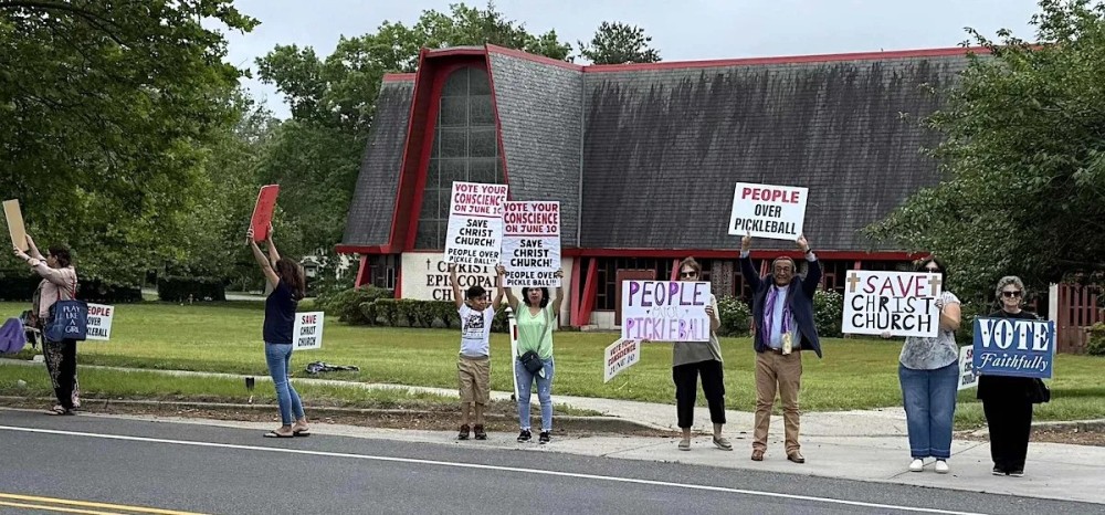 Members of Christ Episcopal Church in Toms River, New Jersey, urge drivers to help the parish fight the mayor's planned land grab. (Photo courtesy of Denise Henry)